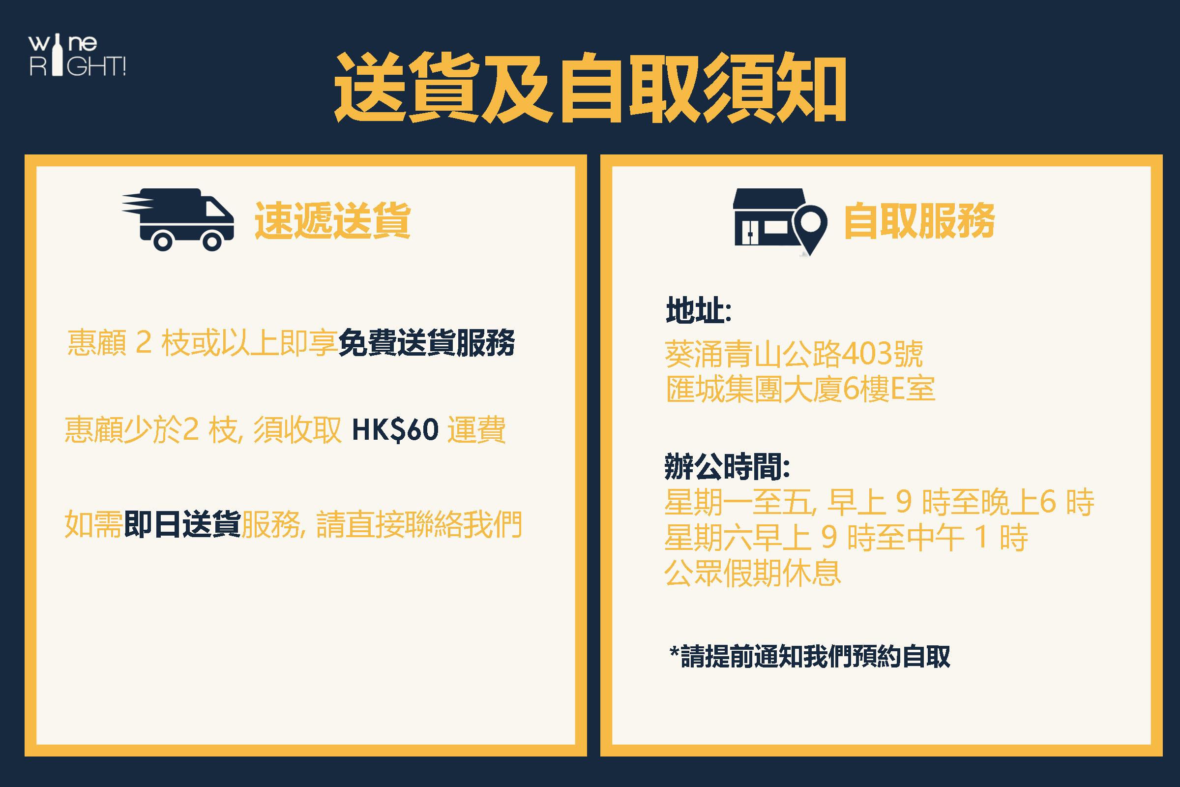 有關任何送貨服務安排, 請致電 9149 6760 聯絡我們