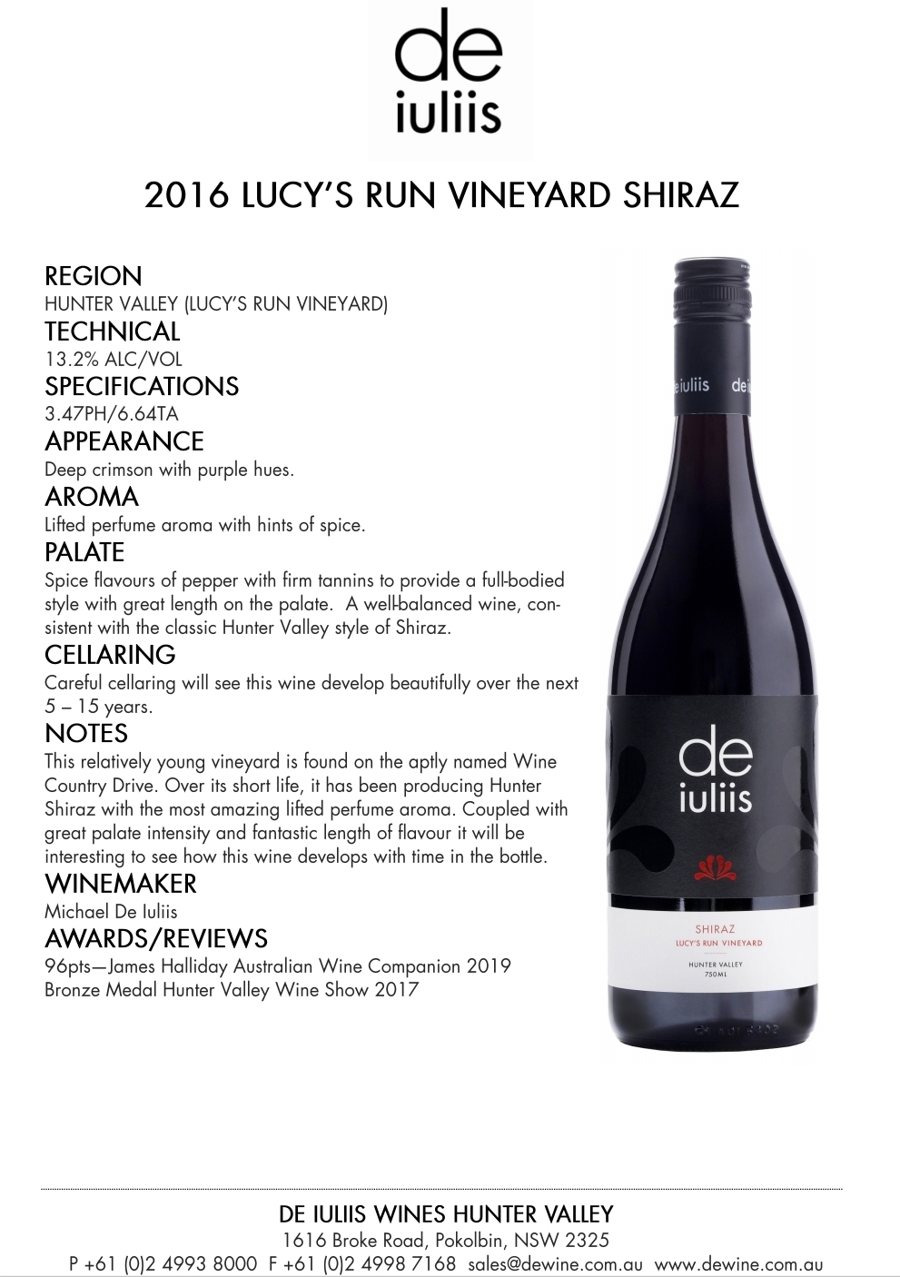 DE IULIIS WINES SINGLE VINEYARD 'LUCY'S RUN VINEYARD' SHIRAZ (2016)