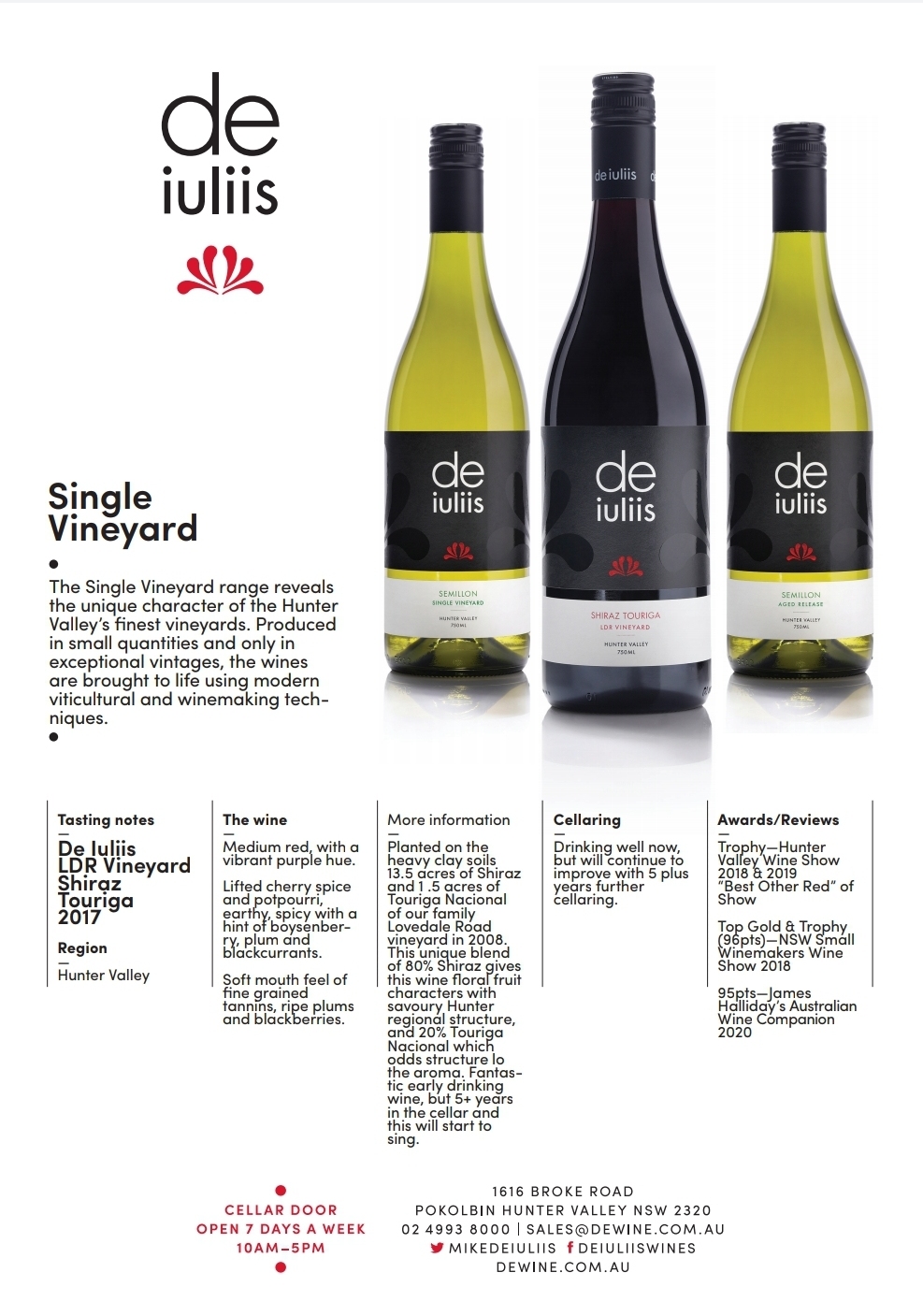 Planted on the heavy clay soils 13.5 acres of Shiraz and 1.5 acres of Touriga Nocional of our family Lovedale Road vineyard in 2008. This unique blend of 80% Shiraz gives this wine floral fruit characters with savoury Hunter regional structure and 20% Touriga Nacional which adds structure to the aroma. Medium red with a vibrant purple hue in appearance. Lifted cherry spice and potpourri, earthy, spicy with a hint of boysenberry, plum and blackcurrants. Soft mouth feel of fine grained tannis, ripe plums and blackberries. Fantastic early drinking wine, but +5 years in the cellar and this will start to sing!