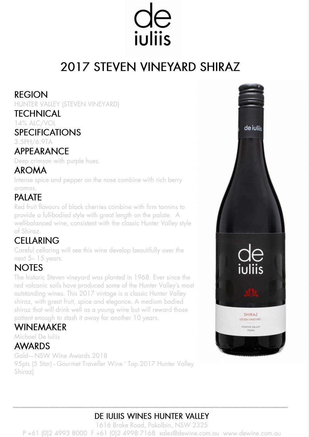 DE IULIIS WINES SINGLE VINEYARD 'STEVEN VINEYARD' SHIRAZ (2017)