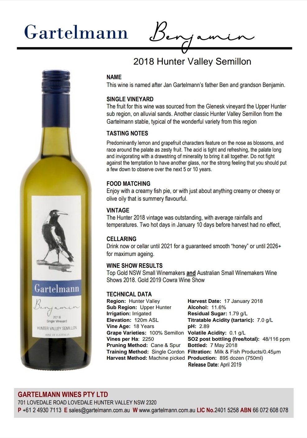 Named after Jan's father and grandson Benjamin. The fruit for this wine was sourced from the Glenesk vineyard the Upper Hunter sub region, on alluvial sands. Another classic Hunter Valley Semillon from the Gartelmann stable, typical of the wonderful variety from this region.