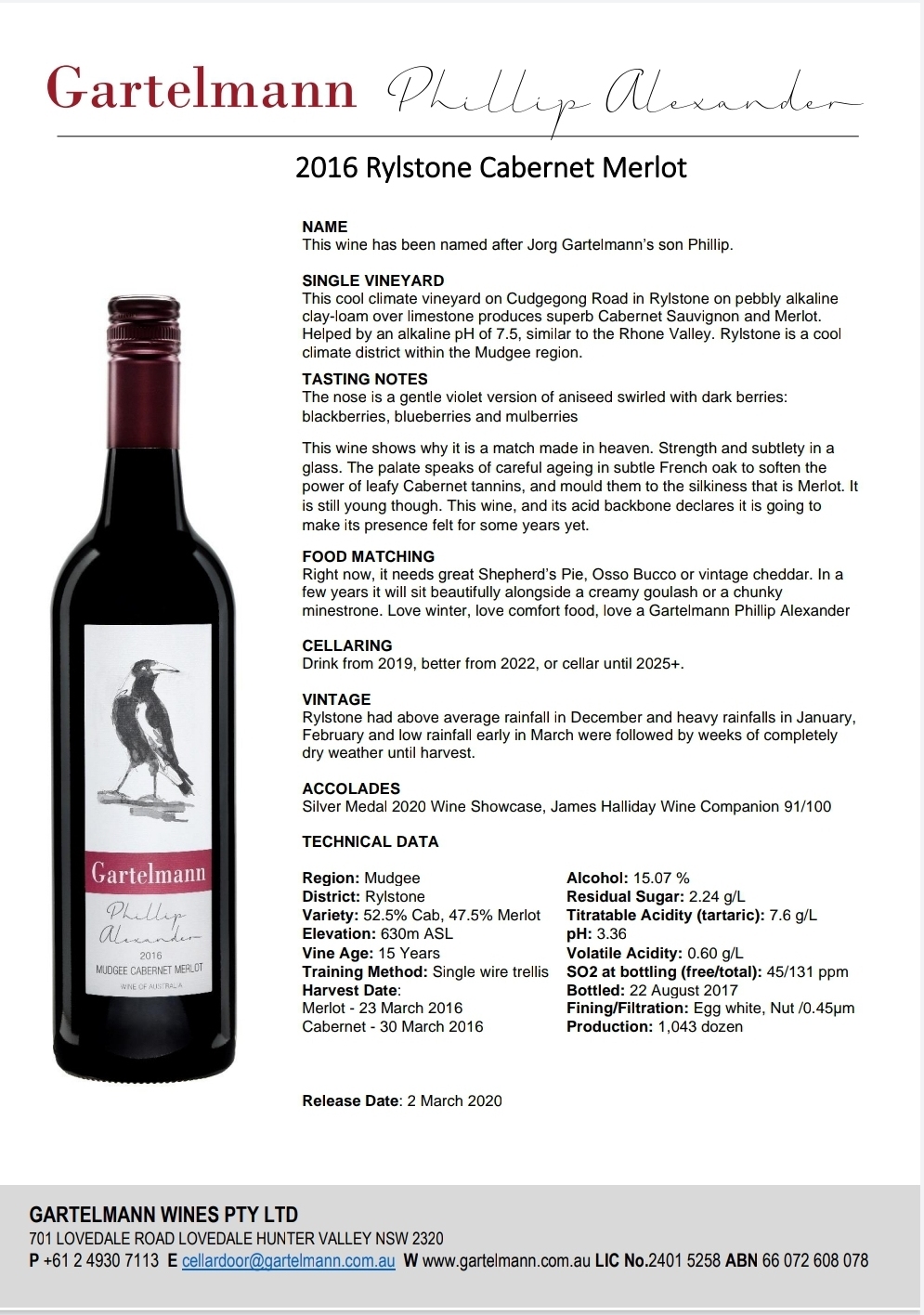 Named after Jorg Gartelmann's son Phillip Alexander. This cool climate vineyard on Cudgegong Road in Rylstone on pebbly alkaline clay-loam over limestone produces superb Cabernet Sauvignon and Merlot.Helped by an alkaline pH of 7.5, similar to the Rhone Valley. Rylstone is a coolclimate district within the Mudgee region.