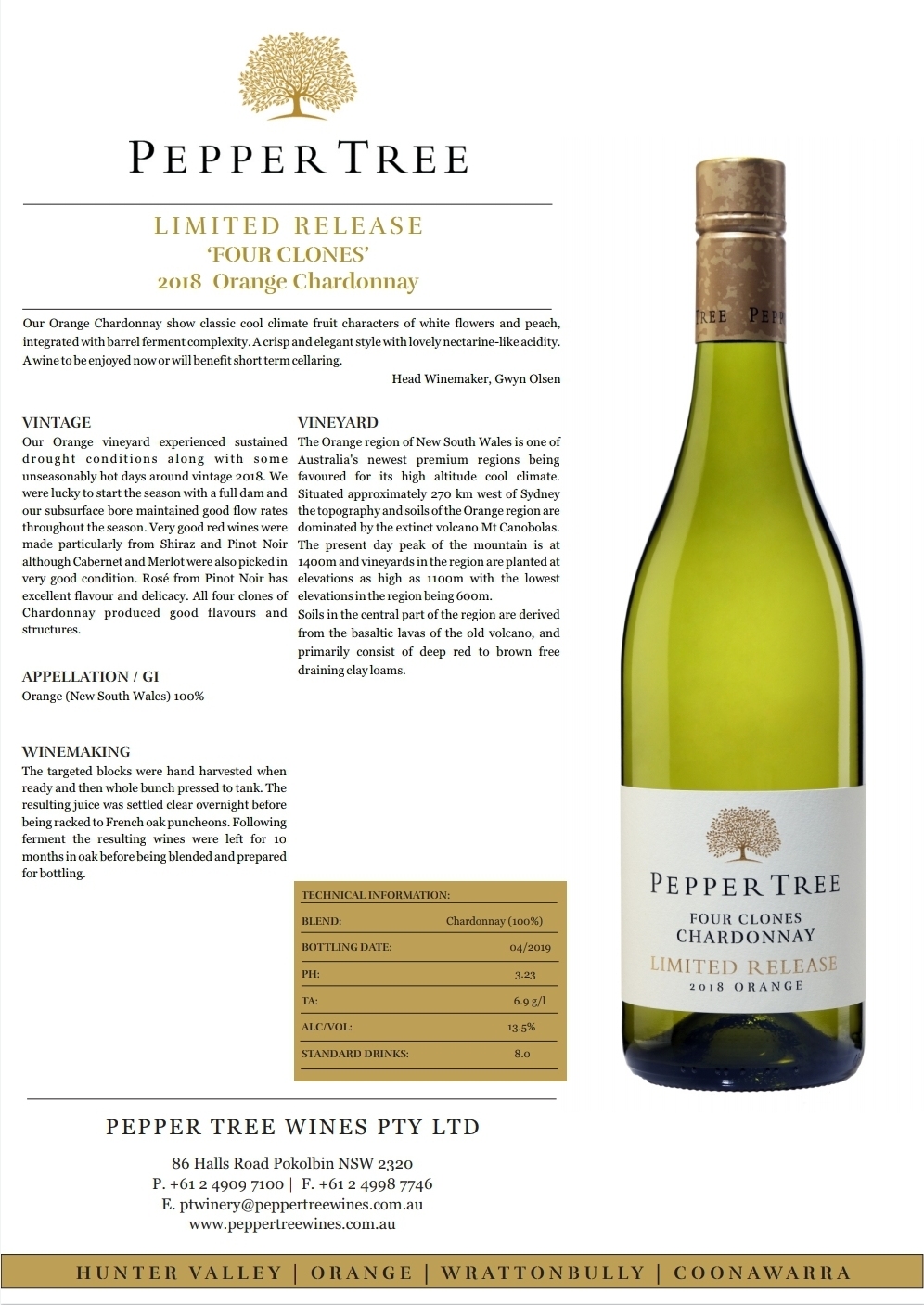 PEPPER TREE WINES LIMITED RELEASE 'FOUR CLONES' CHARDONNAY (2018)