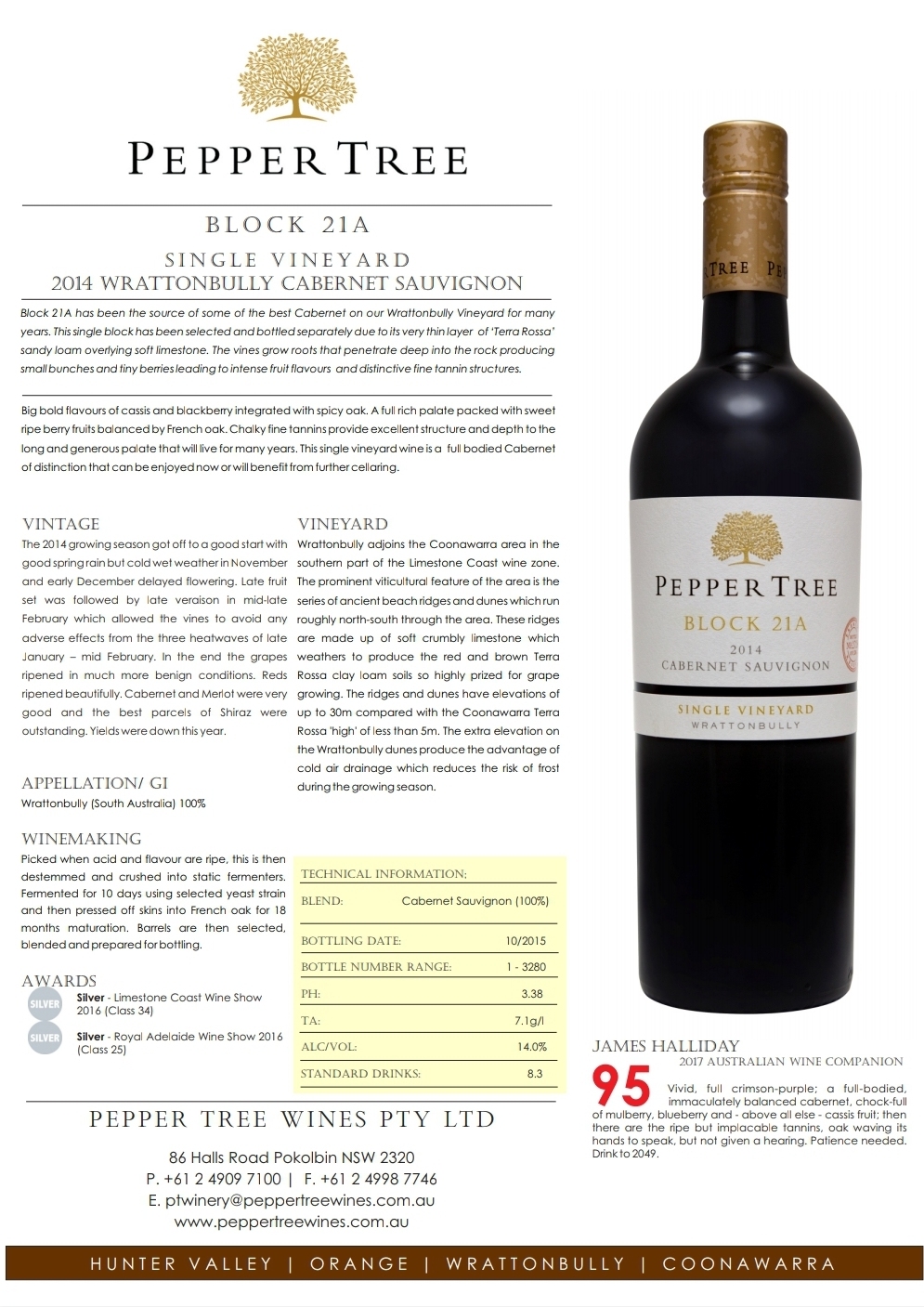Block 21A has been the source of some of the best Cabernet on our Wrattonbully Vineyard for many years. This single block has been selected and bottled separately due to its very thin layer of ‘Terra Rossa’ sandy loam overlying soft limestone. The vines grow roots that penetrate deep into the rock producing small bunches and tiny berries leading to intense fruit flavours and distinctive fine tannin structures.
