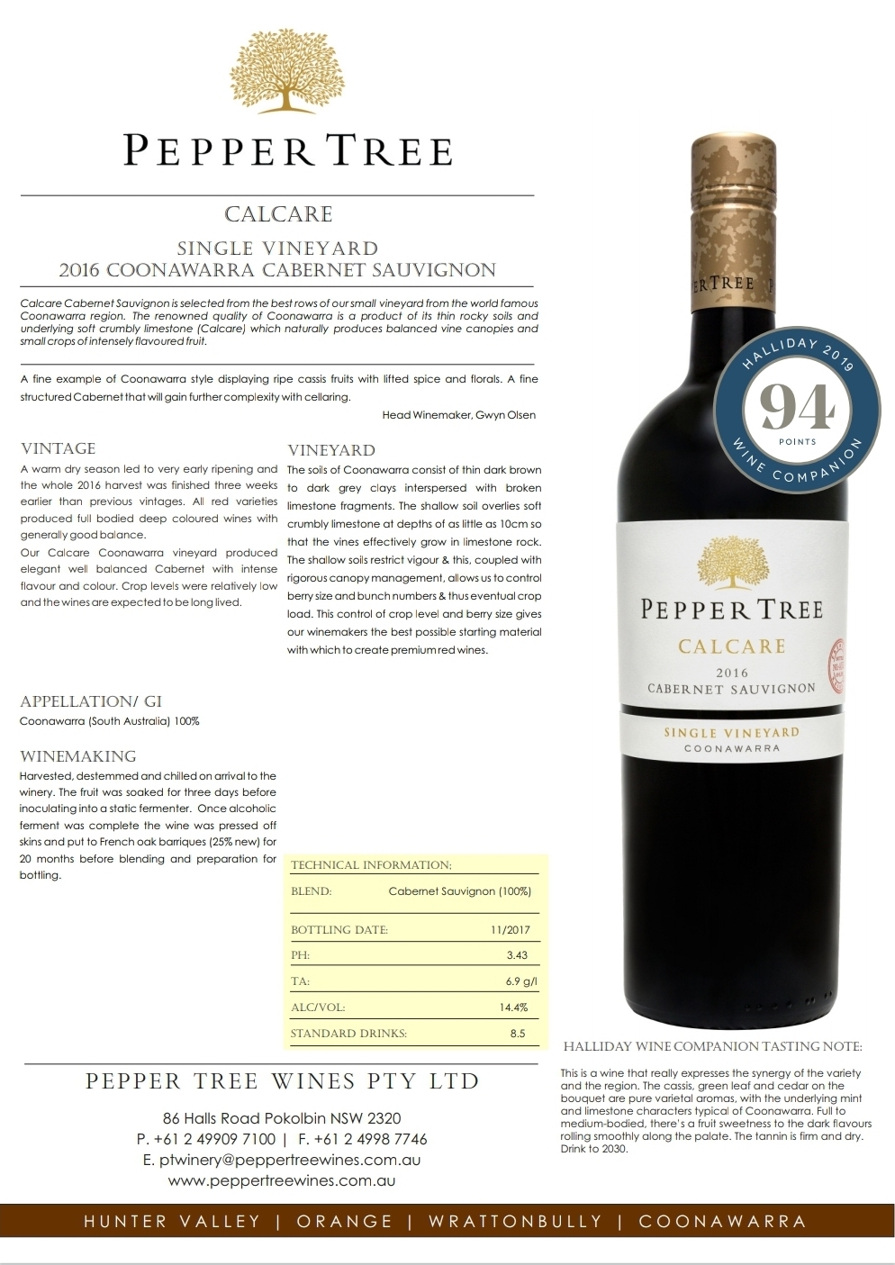 Our Calcare Cabernet Sauvignon is a fine example of the Coonawarra style displaying ripe cassis fruits with lifted spice and florals. A finely structured Cabernet that will gain further complexity with cellaring.